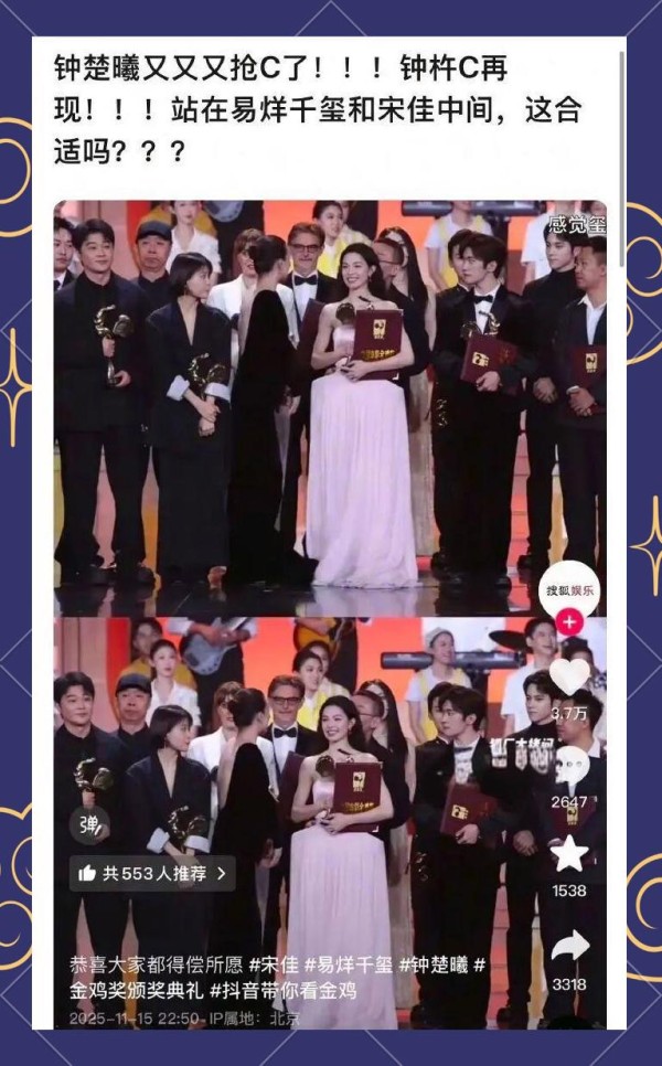 在金鸡奖颁奖典礼的合影环节,钟楚曦再次成为众人关注的焦点。与之前在vogue盛典上的争议相似,她的站位选择在合影时同样引发了不小的争议。按照惯例,合影中影后和影帝通常会占据C位,彰显其殊荣。然而,今年钟楚曦却选择紧贴宋佳,站在了影帝和影后的中间位置,这一选择无疑再次将她推上了风口浪尖。