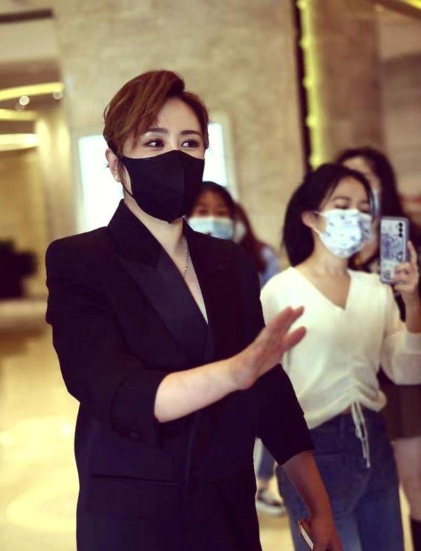 马丽身着一套深邃的纯黑西装,口罩遮面,步伐坚定地走向晚会现场。粉丝们热情地与她打招呼,她则以同样热烈的回应挥手致意,并附上一个比心手势,尽显亲切与魅力。