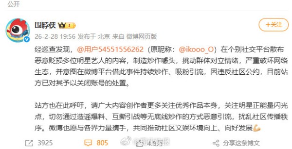 #王一博聊天记录爆料人被封号#【#王一博爆料号被封#】 2月28日晚,@围脖侠 发文表示@用户54551556262(原昵称:@ikooo_O)在个别社交平台散布恶意贬损多位明星艺人的内容,制造炒作噱头,挑动群体对立情绪,严重破坏网络生态,并意图在微博平台借此事件持续炒作、吸粉引流,因违反社区公约,目前站方已对其予以关闭账号的处置。