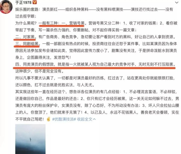 于正发长文谈娱乐圈的套路分为:演员新红、组织各种黑料、没有黑料喷演技、演技还行找过去、没有过去抠字眼这五步。详细阐述「黑」的类型分三种,营销号黑、对家黑、同剧组黑以及同类演员的假想敌。