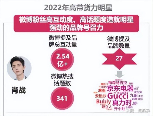 据不完全统计,肖战目前已经手握43个代言,从高奢品Gucci、TODS、真力时、奥迪,到日用品:拉夫劳伦、梅森马吉拉、YSL、NARS、安热沙、滴露、六神,食品类:溜溜梅、德芙、益达、统一满汉大餐、怡达、欧扎克等,代言种类丰富,微博娱乐白皮书中,肖战凭借微博粉丝高互动度和高话题度实现了强劲的品牌号召力,微博提及品牌数量达27个,微博提及品牌总互动量达2.54亿。2022年肖战凭借《王牌部队》、《余生请多指教》两部热播剧集收获高关注度,带动商业价值水涨船高,代言数量成为高达43个,但肖战代言的产品数量多,质量依旧有保障,粉丝粘结度更是内娱独一份,作品傍身、产品质量高、粉丝粘度强、知名大,让肖战成为2022年高带货力明星,肯定是实至名归。