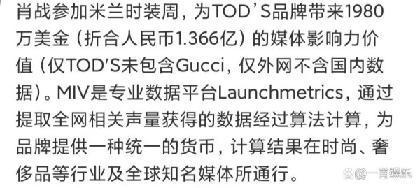 肖战不仅仅签约代言数量多,品牌续约率也高达90%,这就可以看出品牌方对于肖战这位代言人那是非常满意的。不过想想也就知道了,肖战个人形象优越,《陈情令》、《王牌部队》、《斗罗大陆》、《余生请多指教》等作品,纷纷走出国门,破界、跨界、闯世界,肖战用作品打开了国外市场。高奢代言突出肖战时尚表现能力,就拿肖战米兰时装周一系列活动我们就可以感受到肖战在商务价值方面到底有优秀,超过240个媒体报道并提及了肖战米兰时装周,生图登日本moviestar封面,成为大众娱乐项,畅销第一位 。据外网统计,肖战个人在米兰时装周期间,为TOD'S带来了1980万美元的媒体曝光价值,比往年时装周最高时期,还高五倍,此项数据还不包含Gucci。所以肖战能够坐在TOD'S的CEO,及《穿Prada的女王》时尚女魔头原型安娜的中间的C位,实至名归!