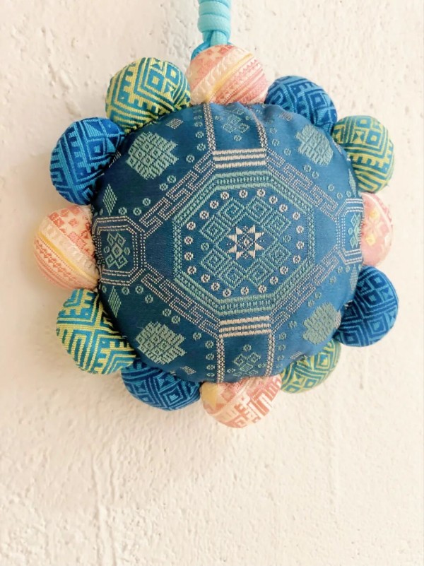 在年前,李岢接到了一个订单,是歌手Ella陈嘉桦的歌迷委托自己将一个小太阳的挂件设计图用壮锦呈现出来送给偶像。李岢用了一个星期,从纹样、打板再到缝制,最终才呈现出这些精美的壮锦挂件。“小太阳挂件的圆形主体部分,我选用的是月蓝色的蟒龙纹壮锦,前面是以太阳纹为主,背后是鱼纹和鸟纹,寓意光芒璀璨,前程似锦,海阔凭鱼跃、天高任鸟飞。”李岢的巧思和用心,被歌手陈嘉桦看在眼里。在演唱会前和演唱会上,陈嘉桦特别展示了一番这些壮锦手作饰品。