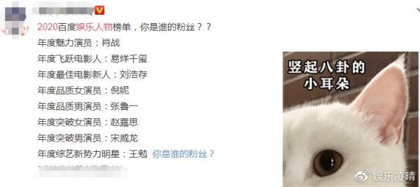 而这边湖南台在给员工颁奖,但另外一边的某公司却给娱乐圈中的明星颁奖呢。没错,某度就对于2020年热度高、人气高、口碑佳且影响力大的明星做出了颁奖。