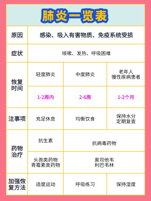 轻度肺炎患者,在得到及时治疗后,通常可在1-2周内感受到症状的减轻和体力的逐步恢复。对于中至重度肺炎患者,恢复时间可能需要2-6周,这期间你会看到肺部炎症的逐渐消退和呼吸功能的改善。而对于老年人或慢性病患者,康复过程可能相对较长,一般可能要1-2个月,此时需要耐心和额外的细心照料。