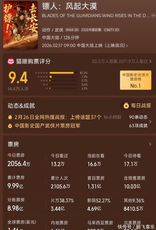 真没想到,春节档最大的惊喜竟不是那部自带流量的《飞驰人生 3》,而是这部原本不被看好的《镖人:风起大漠》。要知道武侠片这两年多难混啊,再加上中途换女主、补拍烧钱,能顺利上映都算奇迹。可它偏偏就成了黑马,豆瓣直接飙到 7.5 分,票房更是上演了罕见的“四连逆跌”,预测值一路狂涨,这翻身仗打得实在太漂亮了!