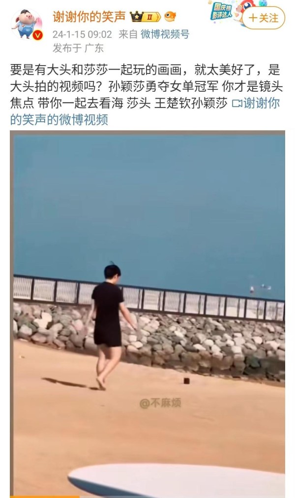 由于被留在多哈打比赛,没有跟随国乒大部队回国,再加上多哈站的比赛还有一段时间要打,孙颖莎、王楚钦等人有了一个短暂的小假期,孙颖莎穿着短裤短袖,光着脚丫走在沙滩上面,看得出孙颖莎很放松。孙颖莎在沙滩上面散步的视频被曝光之后,引起了很多球迷的关注,有球迷评论道要是大头和莎莎一起玩的画面就好了,同时发出疑问是大头拍的视频吗?