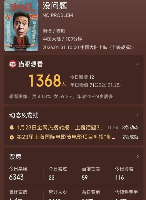 他首次独挑大梁主演的电影《没问题》,在上映两天后,累计票房仅为6.4万元,这个数字甚至买不到一辆入门级面包车。