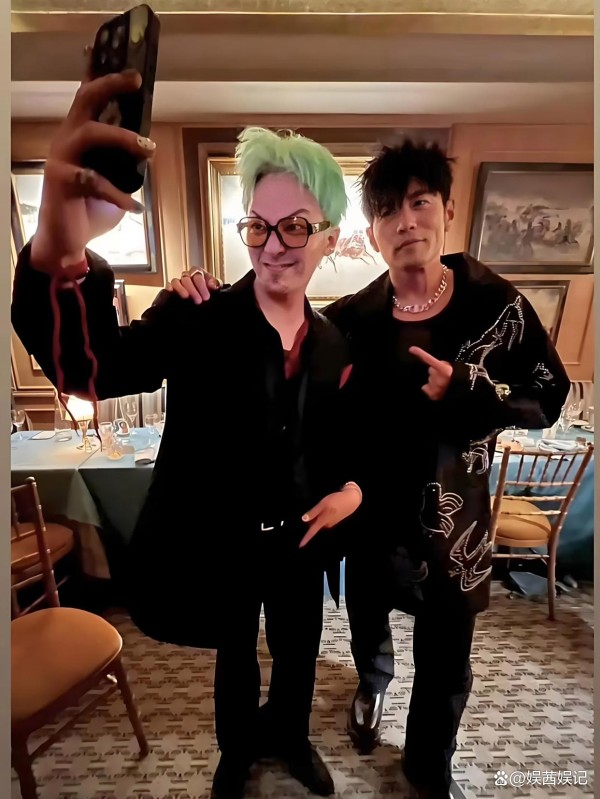 这种有品味又不张扬的环境设置,与两位巨星的身份高度契合。 最引人注目的无疑是照片中两位主角的穿着。 周杰伦选择了极其经典且不易出错的搭配——一件剪裁合身的黑色短袖衬衫,领口随意地解开了一颗扣子,既保持了型男的利落感,又透着一股不费力的随性。