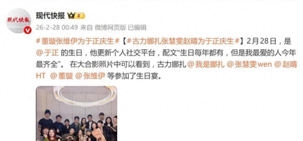 2月28号刚过零点,圈里那位话题度拉满的编剧于正,准时准点在网上晒出了一组庆生大合照。这时间掐得,比春晚倒计时还准,关键是人家配的那句话挺有嚼头,说“生日年年有,但今年最爱的人最齐全”。这话刚冒头不到半个钟头,果不其然,热搜榜上就给他腾出位置了。你瞧瞧照片里那一张张熟脸:古力娜扎、董璇、张慧雯、张维伊、赵晴……好家伙,这阵仗哪像是私下里吃个长寿面啊?网友们调侃得挺到位,说这简直就是一场小型行业峰会,圈里的半壁江山快被他这一个包间给装下了。