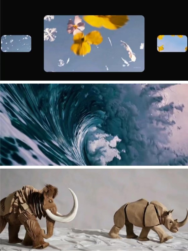 这些新功能让Sora在用户手中变得更加可控。据OpenAI展示的案例,用户可以要求视频中的门打开、将图书馆替换成宇宙飞船;将一个飘雪的视频和一个花朵降落的视频合并在一起,就会出现花朵与雪花同时降落、最后变成只有花朵降落的一段视频,过渡自然;将花朵开放闭合的视频重复,花朵将会持续重复开放闭合的动作,将翻滚海浪的视频重复,则会出现一个不断涌动的海浪,这些重复的视频不会出现视频间机械拼接的迹象;将大象和犀牛行走的画面换个风格,则能变成黑白风格,或者变成纸工艺大象和犀牛行走的画面,或者更换他们所处的背景。