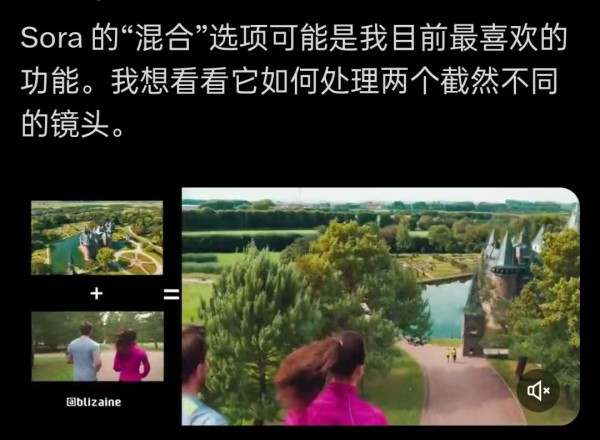 也有用户在社交平台上分享了他如何使用Sora将两个视频融合在一起的功能。该用户用了一个俯拍城堡的视频和一个人物在林间奔跑的视频,融合后,可以看到镜头下降到一条林间小路上,远处看得到城堡,近处看得到人物在奔跑,过渡真实,不足之处则在于人物的身高一开始与树木几乎齐平,然后迅速下降,有坠落的感觉。