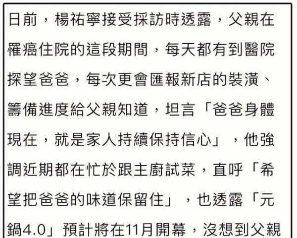 你看那张他晒出的合照,一家人紧紧围绕在病床边,手中传递着温暖,眼中却并无悲伤。那一刻,他们不是在互相道别,而是在以行动证明:无论命运如何变迁,他们的爱始终如一,坚不可摧。杨祐宁的父亲曾是一位美食家,他的火锅店曾是街坊邻居的热门话题。那时的生活充满了烟火气,养活了一家人的同时,也留下了无数难忘的回忆。如今,火锅店的火已熄灭,锅也已冷却,但那些美味与回忆,却永远留在了家人的心中。杨祐宁说,他会每年在父亲的生日时,煮上一碗父亲最爱的牛肉汤,以此纪念那段难忘的时光。