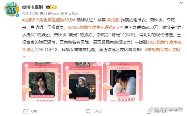 #2025微博年度角色评选#正如火如荼地展开,这场属于二次元与影视圈的狂欢盛宴,不知你可曾为心仪的角色投下珍贵一票?原以为今年的榜单会如春日花园般百花争艳,谁料定睛细看——好一个"男神天团"的专属派对!榜单上清一色的俊朗身影,仿佛误入了某场顶级男模的时尚盛典,让人不禁莞尔。这场看似全民参与的评选,实则成了各路男神们暗自较劲的竞技场,倒也别有一番趣味。