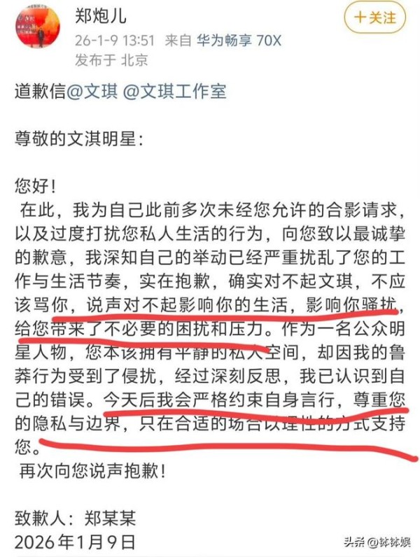 1月9日,该男子在网上发文,向演员文淇道歉,该男子表示,他不该在自己的要求未被满足后辱骂文淇,给文淇带来困扰和压力,文淇能够原谅。