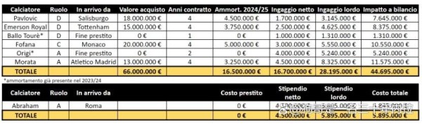 总体而言,最贵的依然是来自马德里竞技的前锋莫拉塔,球员的高额薪水是一笔不可小觑的支出预算。而单就转会费而言,帕夫洛维奇、埃莫松和福法纳的直接成本则更高。