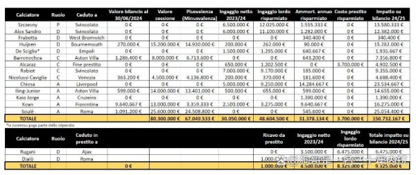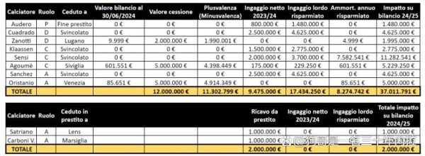 直接出售:奥里斯塔尼奥、阿古梅、萨诺蒂,收入约为1200W欧元。此外,自由离队的球员诸如森西、克拉森等人的摊销成本也被计算在内。