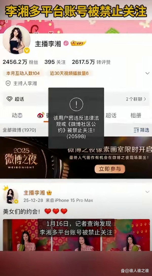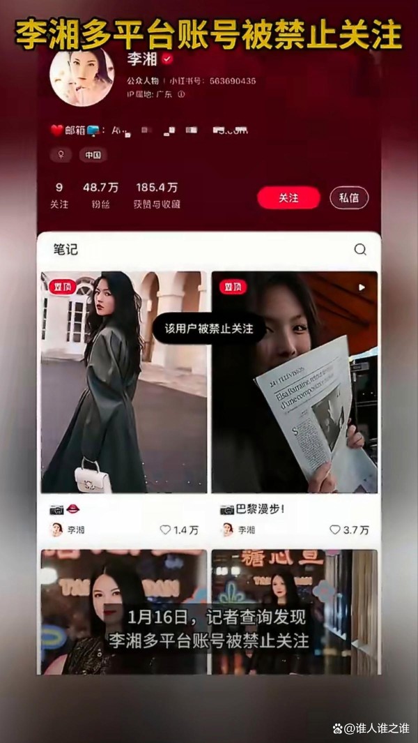 李湘多平台账号被禁,原因曝光!微博、抖音、小红书集体禁止关注