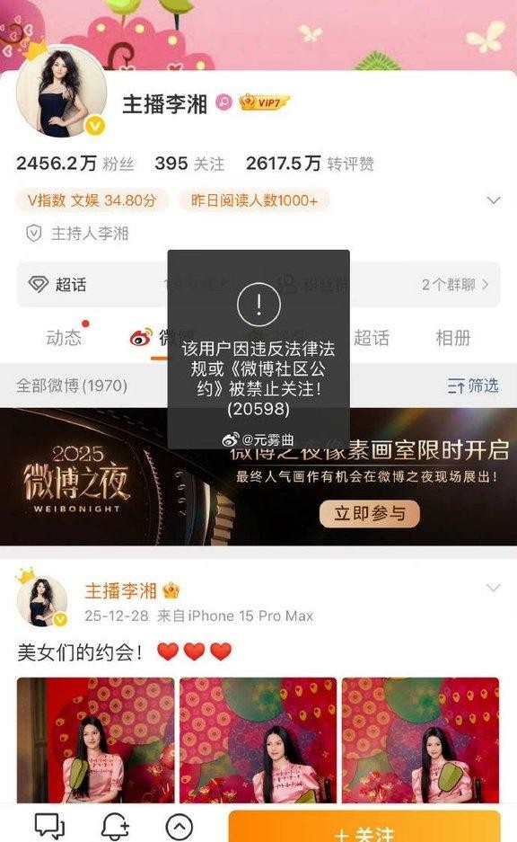 打开李湘的微博页面,跳出一行醒目的官方提示:“因违反法律法规或《微博社区公约》被禁止关注”。抖音、小红书也一样,新用户的“关注”按钮彻底失效。