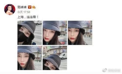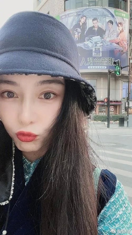 范冰冰穿着黑色渔夫帽和老式的复古绿色粗花呢外套 ,搭配黑色背心。 她站在路边,和她弟弟在她身后的购物中心广告牌上合影。 她皮肤白皙,没有任何瑕疵,红色的嘴唇性感迷人,嘴巴嘟嘟很可爱。 看起来不错,仍然像个少女一般。