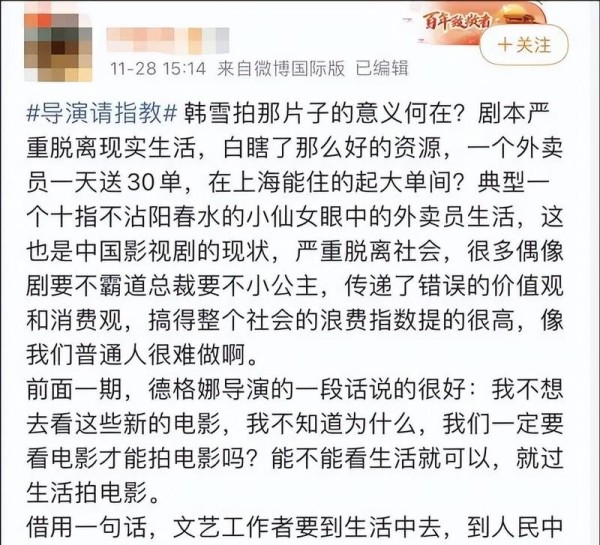 转折点出现在她自己尝试导演的短片中。她为外卖小哥拍摄的短片,因其过度理想化的设定和不符合现实的情节,让人感到完全脱离生活。大家看得出,这部短片不仅缺乏对社会的真实理解,更多的是韩雪自我感动的产物。也许她想通过这部作品表达对生活的不舍和对普通百姓生活的同情,但她所处的生活环境显然与普通人差距太大,最终导致的只是徒有其表的空洞感。