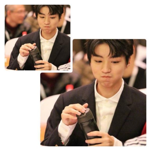 纯黑色的保温杯,简单大气,跟大哥的黑西装白衬衣很配呢!王俊凯把水包在嘴里的模样太可爱了吧~