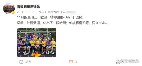 11月16日,明星足球队的社交账号分享了一张大合照,并配文称,11月的星期三,欢迎精神领袖Alan回归。早前他的脚受伤休息了一段时间,他说脚伤初愈要出来走走。