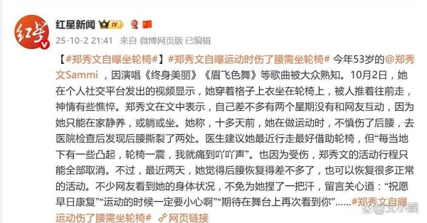 谁能想到,舞台上一向以活力四射著称的郑秀文,竟也被迫坐上了轮椅。10月2日,这位53岁的乐坛天后在个人社交平台发布视频,自曝因运动不慎导致后腰严重受伤,需靠轮椅代步,瞬间引发全网关切。
