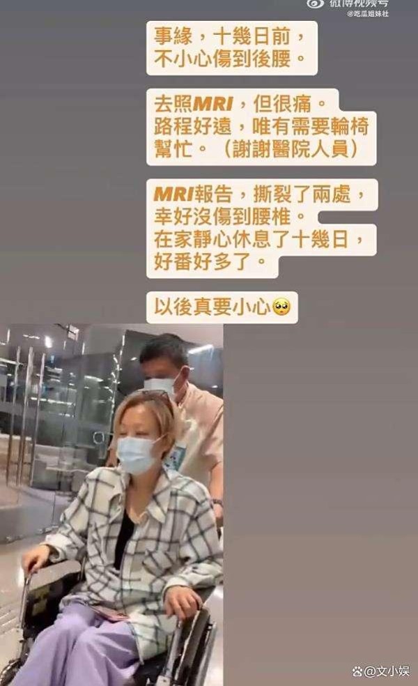 郑秀文伤情更新:后腰撕裂两处,轮椅静养何时回舞台?