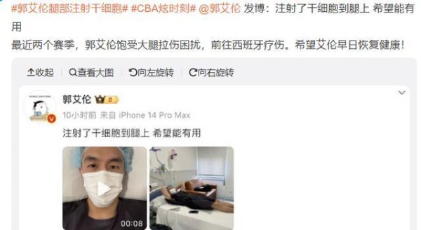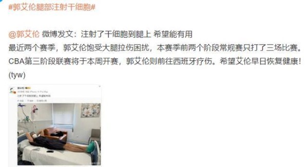 3 月 5 日,辽宁男篮球星郭艾伦发微博称自己在腿上注射了干细胞,希望能对伤病有所帮助。