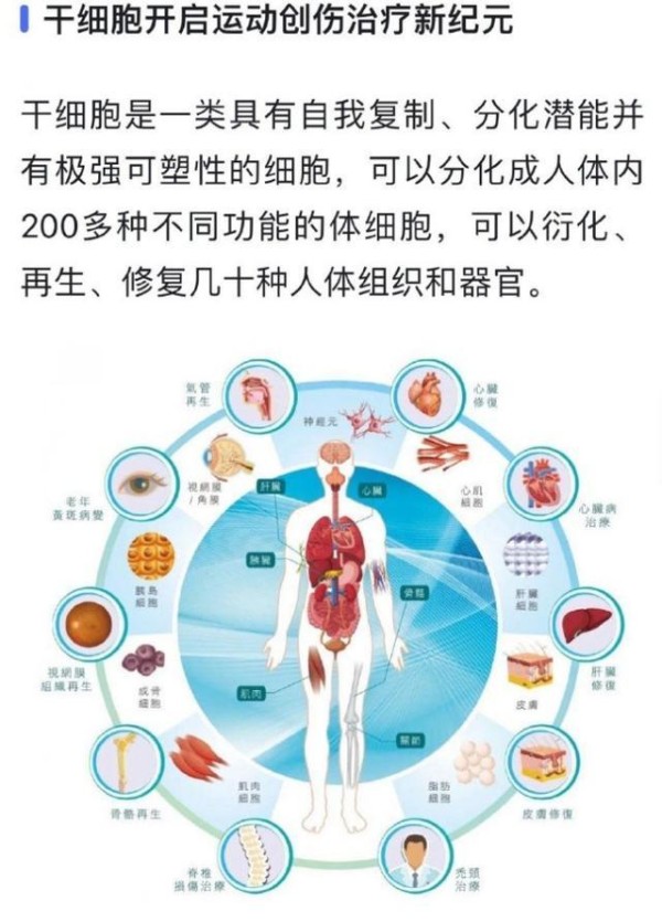 干细胞疗法是时下最尖端、最有用的运动创伤修复手段。干细胞是一种可以自我复制、分化潜能具有极强可塑性的细胞,可以分化人体内 200 多种不同功能的体细胞。