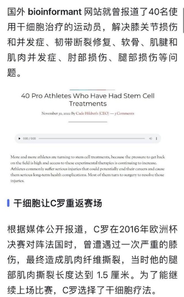 2016 年欧洲杯决赛,C 罗在对阵法国时遭遇严重膝伤,肌肉纤维撕裂,腿部肌肉有 1.5 厘米的撕裂伤。随后,C 罗在西班牙马德里进行了干细胞疗法。2021 年,梅西在美洲杯期间也遭遇肌肉拉伤,他也前往了西班牙马德里进行干细胞疗法,而且他去的机构与 C 罗是同一家。网坛巨匠纳达尔,2013 年就因为遭遇膝伤进行了干细胞疗法,2014 年膝伤痊愈后又对陈旧背伤进行新的干细胞疗法,在 2016 年取得了历史性成绩,成为网球史上第 8 位创下 200 场大满贯赛事胜利的男子球员。