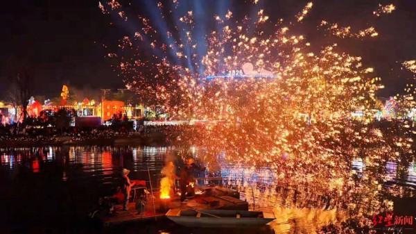 夜色渐浓,园区非遗打铁花表演随之登场。滚烫的铁水被匠人奋力击打,挥洒间化作漫天“金雨”,火树银花在夜空璀璨绽放。游客们纷纷举起手机,定格这震撼瞬间,惊叹声与打铁花的声响交织,将元宵之夜的氛围推向高潮。