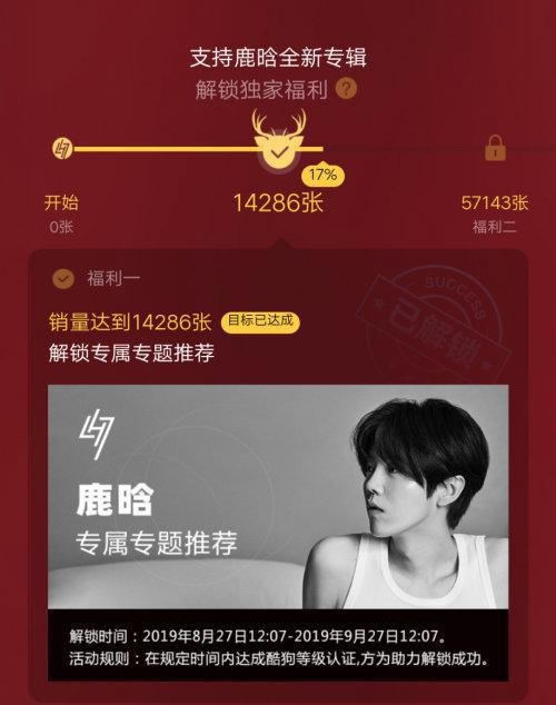 鹿晗三专登陆QQ音乐,43分49秒拿下钻石唱片认证!