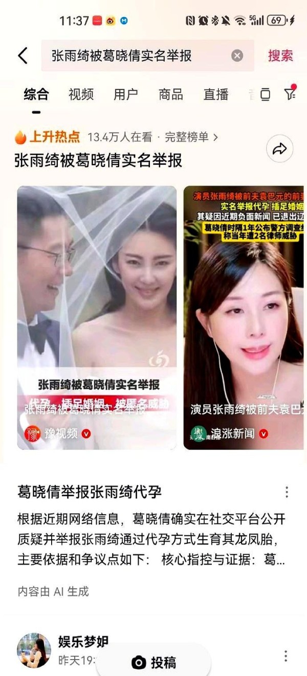 她在《美人鱼》里出名,后来被曝出感情纠纷,前夫袁巴元的前妻葛晓倩在平台实名举报,说张雨绮插足他们婚姻,还晒出了护照和监控资料。