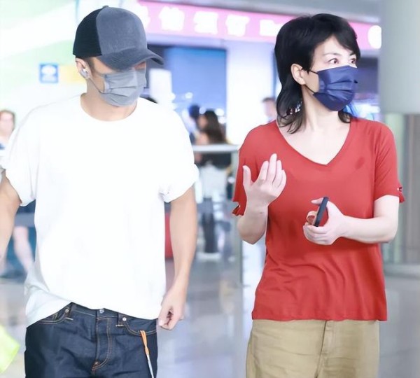 而王菲身穿一件红色的短袖衣服,她戴着一个口罩,看起来精神状态良好。