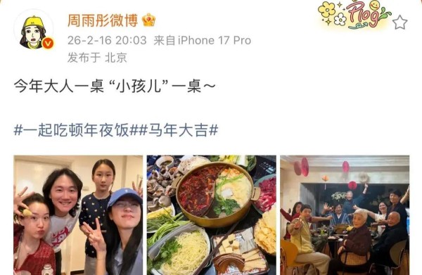 周雨彤选择与家人共度,家中火锅热气蒸腾,全家老少齐聚一堂,素颜出镜的她戴着棒球帽、穿着蓝衬衫,笑容中透出浓浓的亲情。