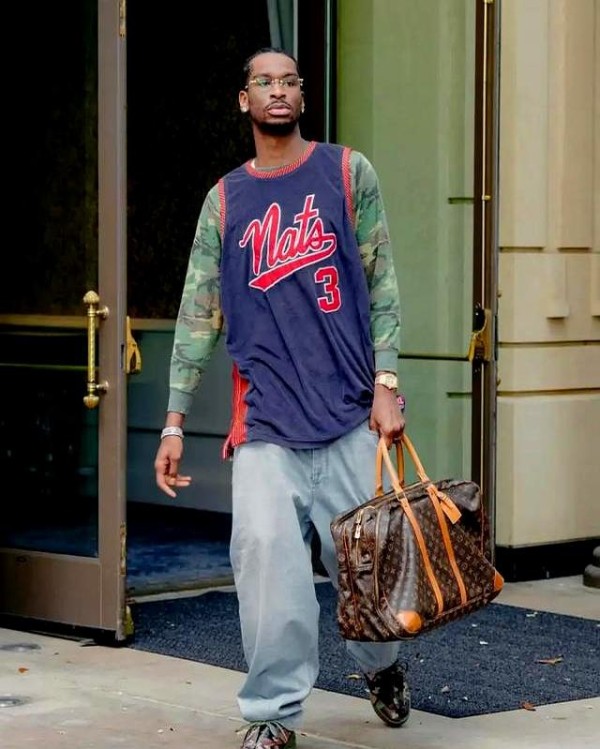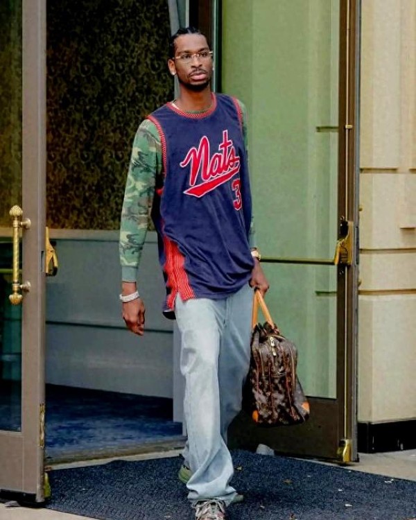 潮流分析师发现,亚历山大近半年街拍都在实验"时间碰撞"概念:用当代科技面料混搭 vintage 单品,把不同年代的篮球文化符号叠穿。上次他用激光切割的透明防风衣套着90年代复古训练裤,这次又用智能材质签名鞋配上古董球衣,形成跨越时空的视觉对话。