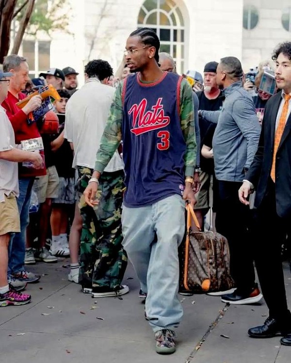 2026年3月2日,体育时尚媒体LeagueFits放出的这组街拍简直像投下颗视觉炸弹。照片里亚历山大把篮球历史和街头潮流玩出了新花样,那件深蓝色的锡拉丘兹民族队球衣胸口还印着老式队徽,下摆故意没塞进裤腰,随性地垂在迷彩绿长袖外面。最绝的是他脚上那双Shai001签名鞋,鞋帮的迷彩纹路和上衣严丝合缝配成套装,连鞋带孔都闪着哑光金属色。