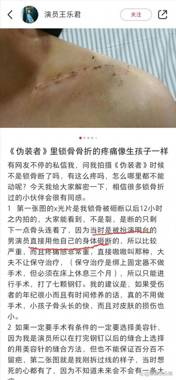 这不是王乐君自己口中的描述,而是在社交媒体上疯狂传播的版本。首先,让我们来看看王乐君亲自发布的原话。据悉,王乐君的爆料始于网友的好奇。不断有粉丝私信她,问《伪装者》拍摄时,她的锁骨是否真的折断?疼痛又有多强烈?