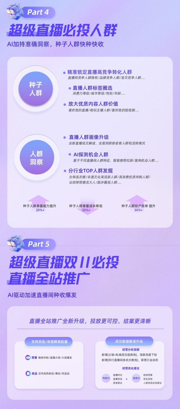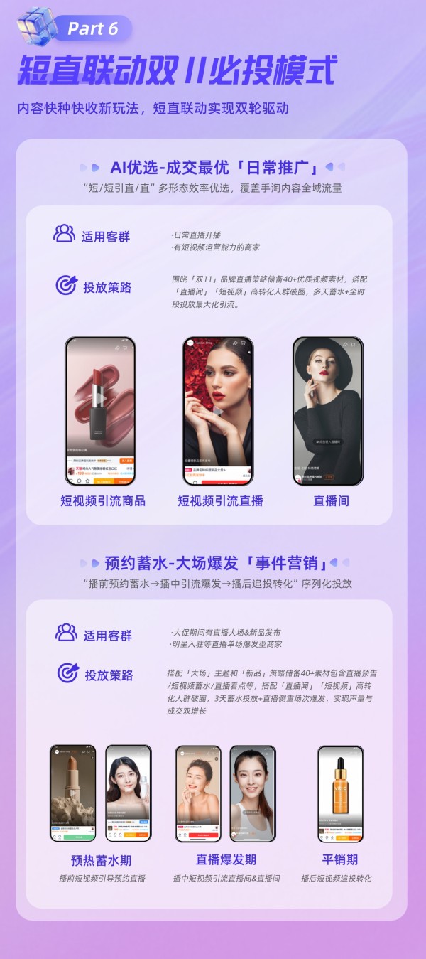 为了帮助商家抓住红利,依托阿里妈妈AI能力,内容营销通过超级短视频与超级直播的双轮驱动,结合短直联动方案,实现从创意洞察、智能投放到转化沉淀的全链路提效。同时,内容营销也推出了专属激励扶持,超级直播商家投入越多,激励流量就越多,普惠全量商家。