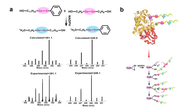 图2. 利用小分子模拟实验,验证含硒高分子胶束通过含硒动态化学反应实现TrxR活性抑制机理。