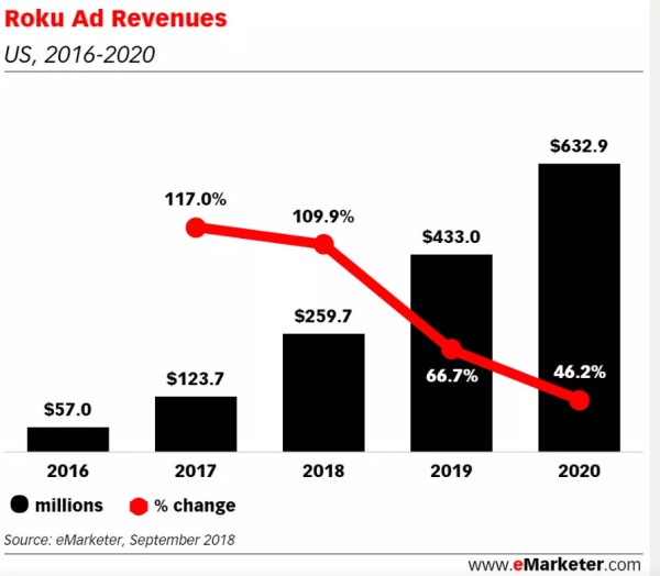 Roku广告业务快速发展,成为平台业务的营收支柱。根据调研机构eMarketer的数据,Roku 2018年广告收入近2.6亿美元,而Roku 2018年营收为7.4亿美元,也就是说广告收入占了三分之一。eMarketer预计美国流媒体视频观看者的数量将从2018年的1.99亿增加到2020年的2.093亿,但是广告收入将远远超过观看者的增长,预计Roku在美国的广告收入到2020年将翻一番以上,达到6.329亿美元。