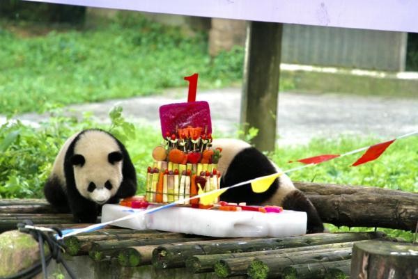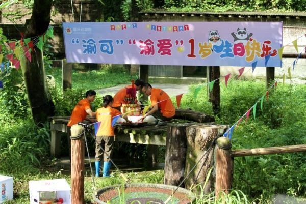 大熊猫双胞胎兄妹“渝可”“渝爱”昨天满一周岁,重庆动物园为它们举办了隆重的生日会。四面八方赶来庆祝生日的“猫迷”们,把生日会现场围了个水泄不通。