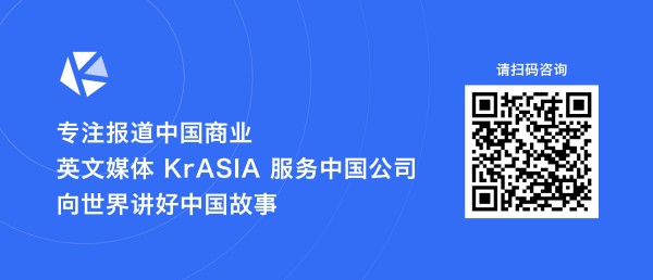 在全球经济复杂格局的当下,英文报道不仅是向海外客户和消费者传递价值主张的重要手段,也是企业在世界范围内的认知沉淀。英文媒体 KrASIA 通过优秀的搜索引擎优化,专业的英文内容和可靠的社交媒体矩阵,以及全球顶级信息数据平台彭博终端和道琼斯 Factiva 等外部收录平台,帮助中国公司提升全球品牌。如果您的公司对英文传播有相关需求,或者希望与 KrASIA 合作提供出海服务,欢迎扫描下方的二维码或点击此处链接,填写表单,获取 KrASIA 媒体服务刊例和工作人员的联系方式。