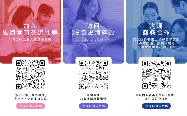 目前,36氪出海学习交流群已经吸引超过16,000位出海人加入,他们来自国内外初创企业、行业巨头、投资机构等。在出海社群里,我们为成员挑选整理每日全球跨境资讯,帮助出海人把握最新动态;定期组织出海交流活动,链接出海生态圈,寻找潜在合作伙伴。欢迎添加36氪出海小助手微信(ID:wow36krchuhai-xzs2)申请入群,一同出海!