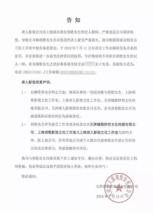 昨日2018年7月12日,网上流传着一张“天津唐人影视股份公司”的告知书,内容大致为:唐人影视公司员工姚瑶在担任胡歌经纪人期间,严重违反公司规章制度,导致公司和胡歌在名誉及经济上蒙受严重损失,公司根据国家法例及公司员工手册规定,于2018年7月11日对该员工解除劳务关系的处罚。