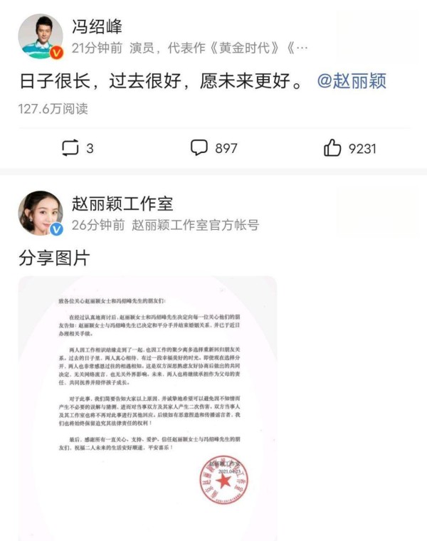 2021年4月,两人工作室同时发声明官宣和平离婚,没有互撕、没有爆黑料,甚至没有一句指责,只说“因工作聚少离多,重新回归朋友关系”,未来会共同抚养孩子。