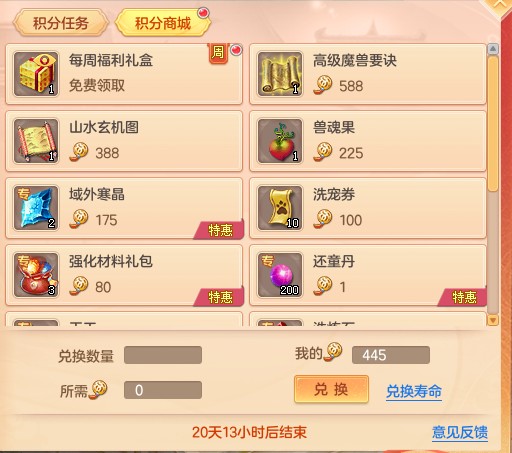 每日登录、达到一定活跃度要求以及参与限时活动时可获得活跃积分,可在积分商城中兑换高级魔兽要诀、兽魂果、糯米凉糕和域外寒晶等丰富好礼。