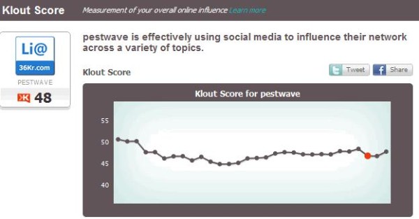 pestwave的Klout影响力指数为48。.这样你就可以随时看到其它用户的影响力,他/她说话的分量有多“重”。